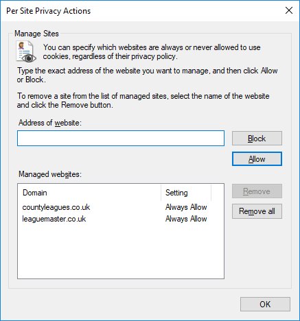 Now add countyleagues.co.uk and leaguemaster.co.uk (see below). This maintains your security but allows you to login.